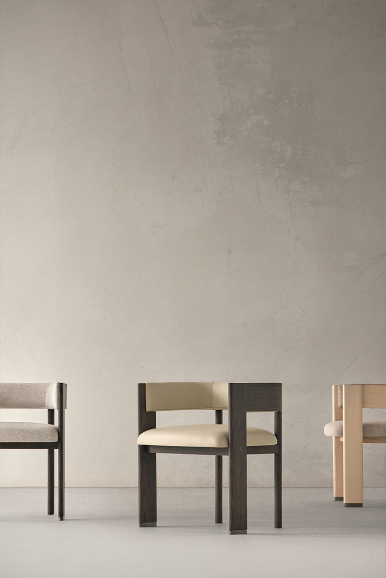 With great elegance and the precision of a tailor, this collection, including a chair, sofa, and armchair, represents a different future for classic lines. It is a solid proposal built in wood characterized by the flat expression of the front legs and the metallic detail of its base. The chair and armchair have a curved backrest that can be seen inside with the same upholstery as the seat, while its rear legs are rounded to gain lightness in the design. The sofa focuses on the shape of its arms, which can be upholstered on the upper part to improve comfort.