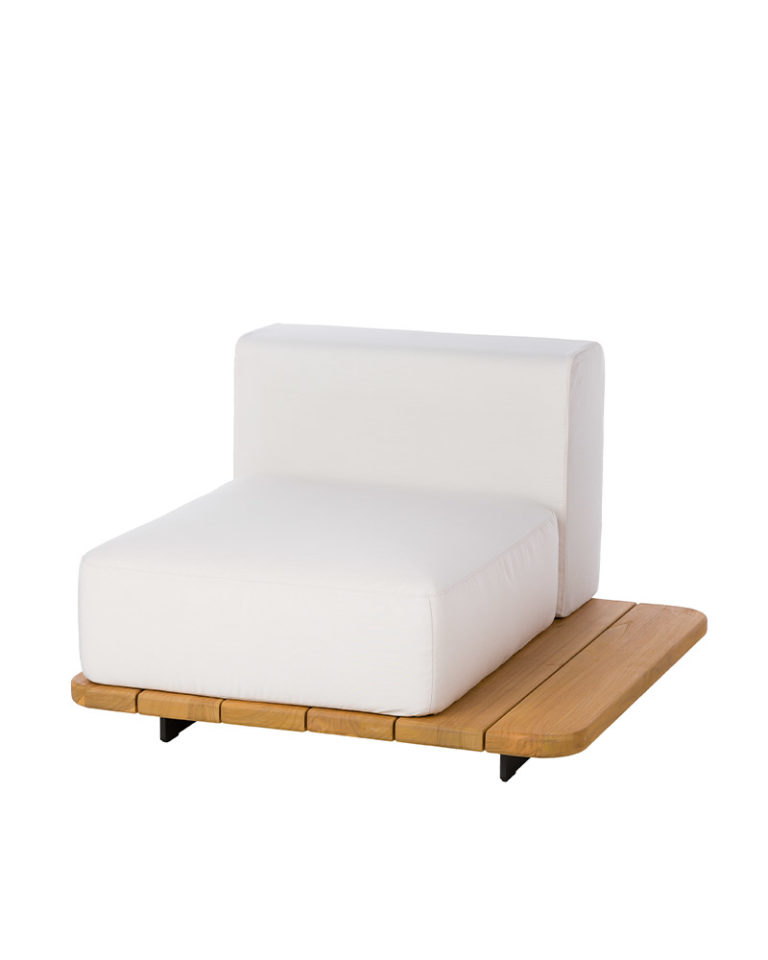 As part of the PAL outdoor sofa collection, this individual seat is defined by a base of solid teak wood slats that supports the different padded pieces of seat and backrest. The platform is slightly raised from the ground by legs made of epoxy lacquered aluminum in olive 64 color, as they are outdoor furniture, they protect it from possible contact with water. The resulting effect is that of a sinuous floating block.