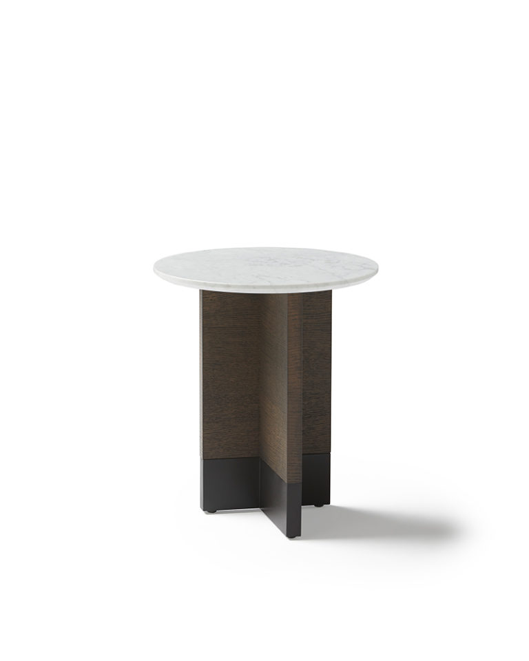 Collection of coffee, occasional and bedside tables comprising circular top made in black or white marble, MDF in lacquer or oak veneer with structure in oak or lacquer. Slate micro-textured lacquer base.