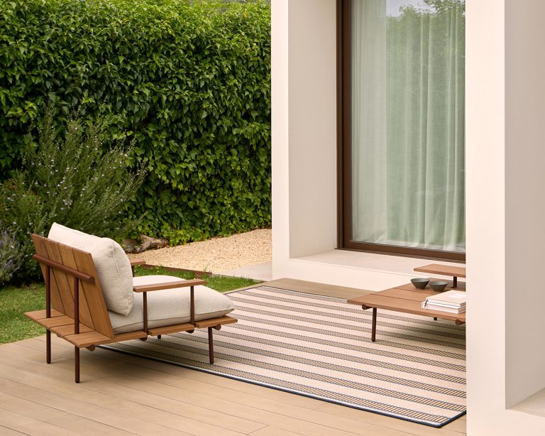 Fabricada con PET reciclado de botellas de plástico, esta alfombra es apta tanto para interior como exterior. Su tejido resiste el uso exterior sin renunciar a la suavidad, creando una superficie que abriga, acoge y se integra con el entorno.