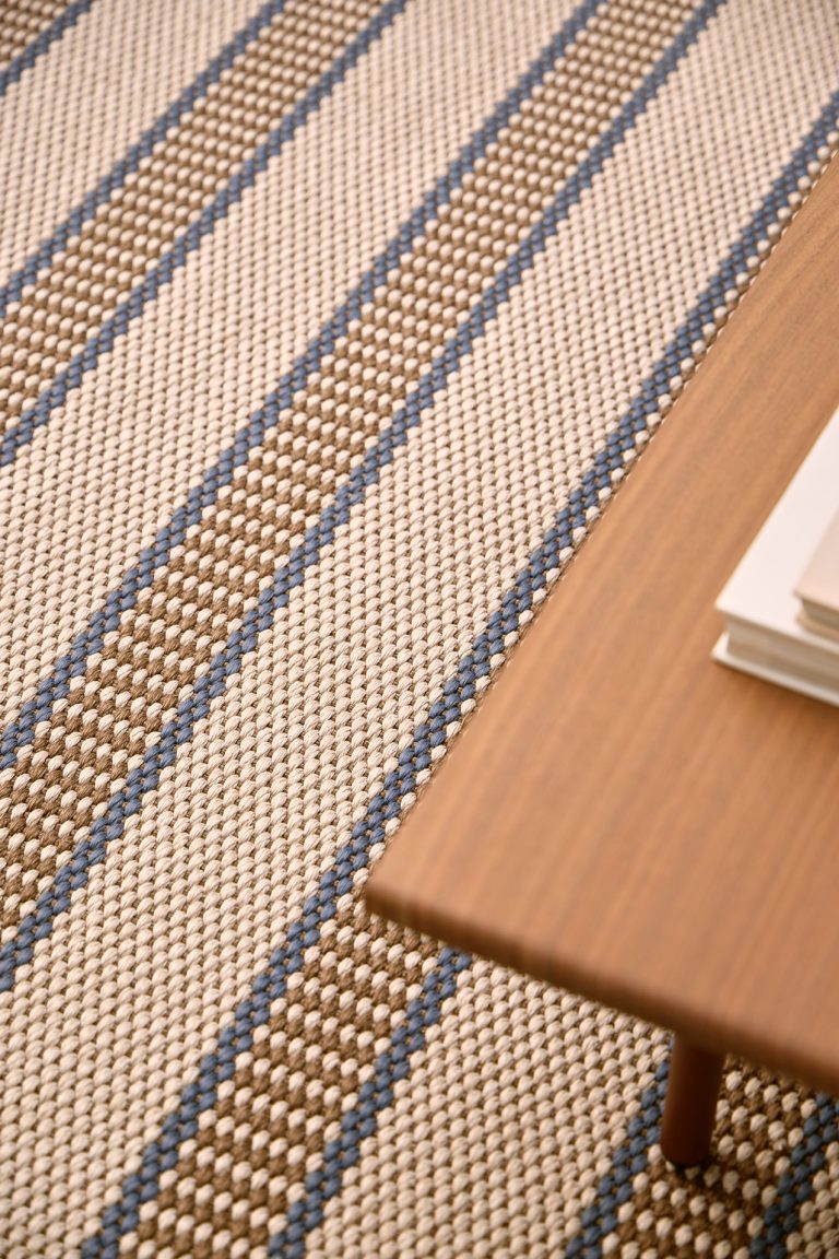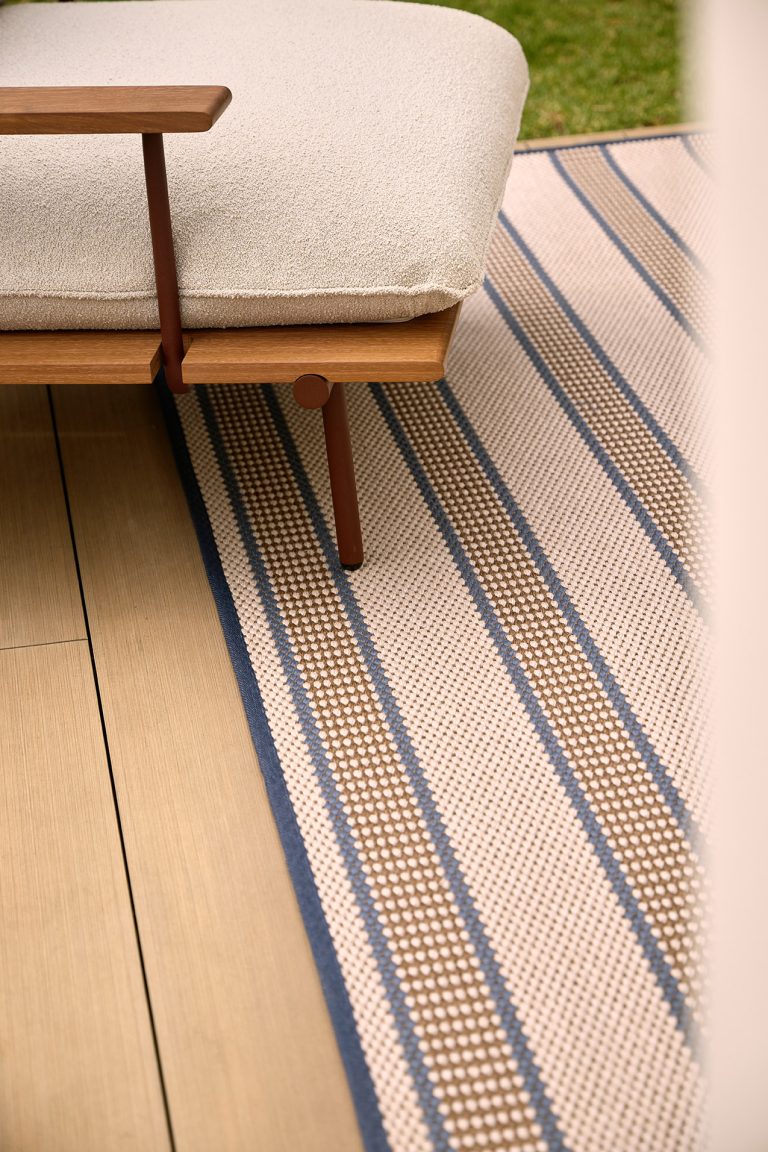 Alfombra de interior y exterior en tonos arena, azul y tostado. Diseñada por Francesc Rifé para Rols Carpets, Aral 01 forma parte de una colección que ordena el espacio a través del ritmo, la repetición y la luz. Este modelo introduce el azul como acento sobre una base cálida de arena, acompañada de un tercer tono tostado que equilibra la composición cromática. Una alfombra que evoca el sol y el mar, y aporta frescura sin renunciar a la calidez.