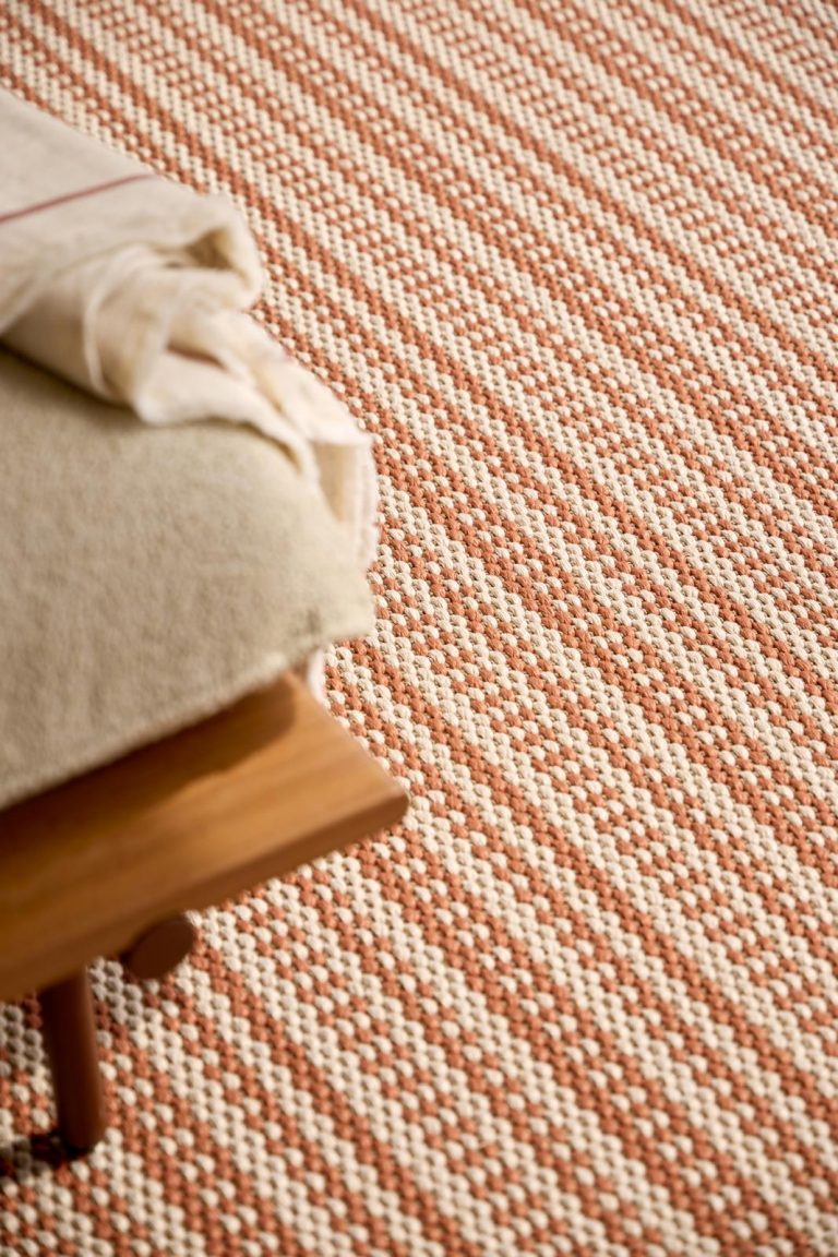 Alfombra de interior y exterior en tonos terracota. Diseñada por Francesc Rifé para Rols Carpets, Aral 02 forma parte de una colección que ordena el espacio a través del ritmo, la repetición y la luz. Este modelo resalta la riqueza del terracota con una versión más densa que intensifica la textura y la profundidad del color. Una alfombra que envuelve y aporta carácter, manteniendo el equilibrio estructural del sistema de rayas.