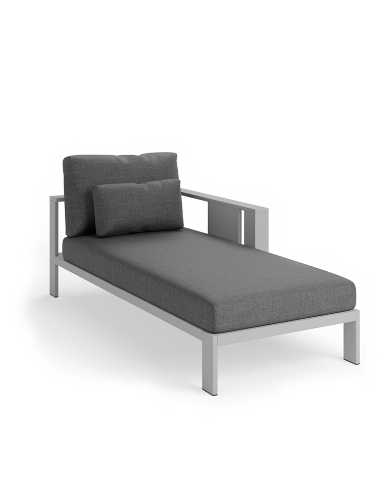 Las líneas sobrias y racionalistas de esta chaise lounge de exterior, elaborada en aluminio, dibujan una pieza de gran presencia y versatilidad estética, capaz de encajar en entornos de estilo muy diverso. Observando en detalle su diseño, se percibe cómo juega con los diferentes planos y dimensiones de las lamas para conseguir una sutil expresión gráfica como único ornamento. El diseño se acompaña de cojines de respaldo y asiento de alta resistencia.