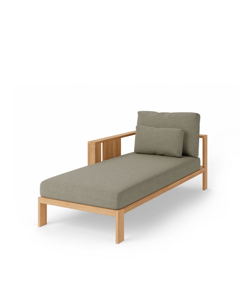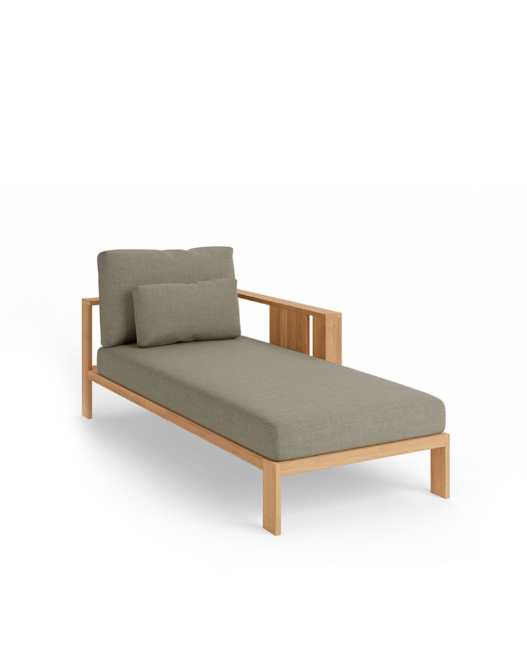Las líneas sobrias y racionalistas de esta chaise lounge de exterior, elaborada en madera de iroko, dibujan una pieza de gran presencia y versatilidad estética, capaz de encajar en entornos de estilo muy diverso. Observando en detalle su diseño, se percibe cómo juega con los diferentes planos y dimensiones de las lamas para conseguir una sutil expresión gráfica como único ornamento. El diseño se acompaña de cojines de respaldo y asiento de alta resistencia.