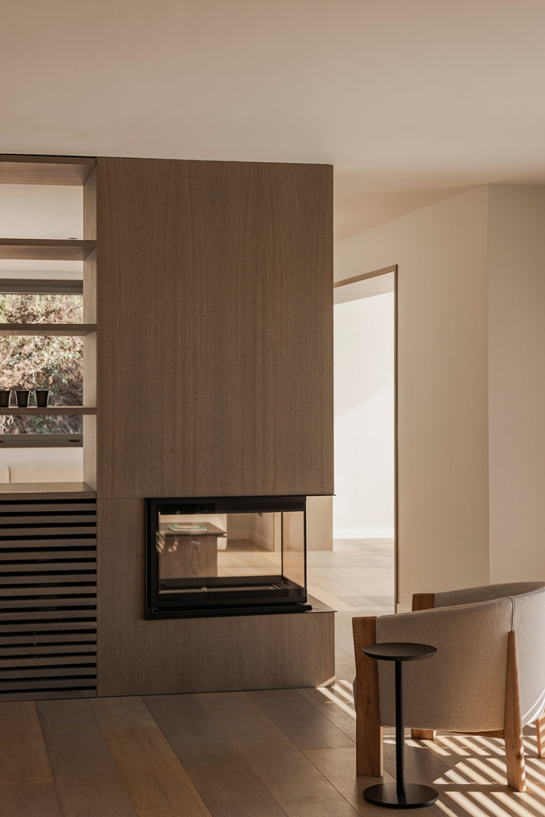 Las mesas de comedor y de centro completan la colección con la misma narrativa en madera de roble, pero con la opción de sobre en piedra. Una de las mesas auxiliares, en cambio, se distingue por su ingenioso sobre giratorio que se abre para extender el espacio funcional.