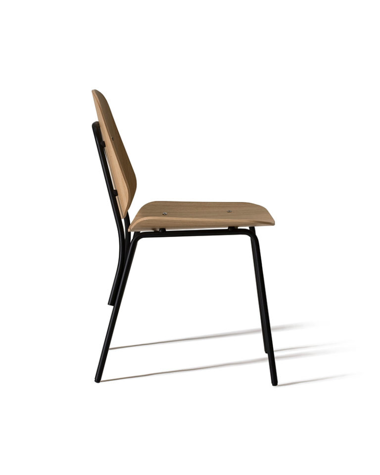 El punto de partida del diseño fue una imagen que permanecía en el subconsciente de Francesc Rifé, la de una de esas sillas tradicionales de los colegios que durante los años ochenta y noventa abarrotan las aulas. COL se ha apoderado de sus dos elementos básicos: estructura tubular y tablero contrachapado, que con un nuevo corte y silueta se conectan a través de una doble estructura metálica.