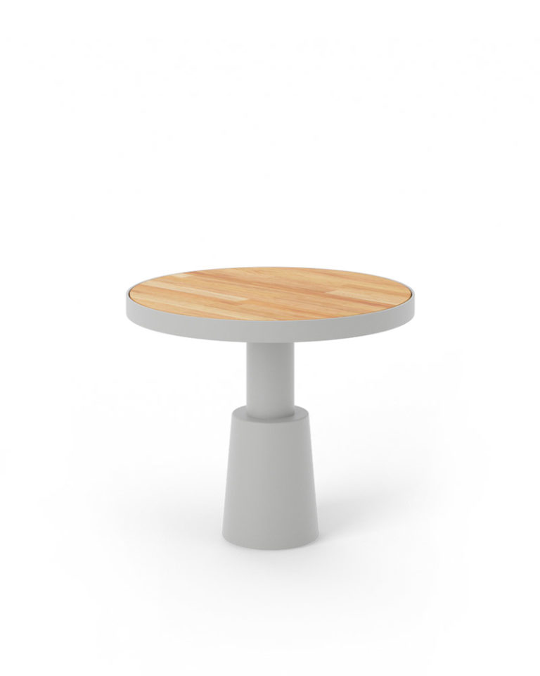 Una colección de mesas auxiliares que toma su nombre de las baterías musicales, y cuya sencillez geométrica y circular está pensada para mejorar la melodía de cualquier propuesta de mobiliario exterior. Esta versión de base cónica está fabricada en aluminio y sobre de madera de iroko.