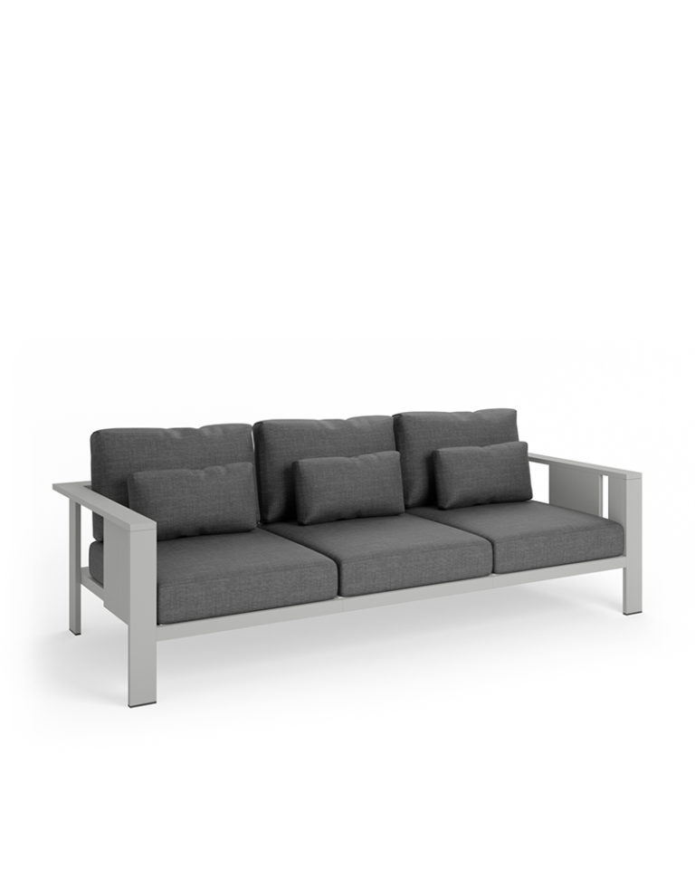 Las líneas sobrias y racionalistas de este sofá de exterior, elaborado en aluminio, dibujan una pieza de gran presencia y versatilidad estética, capaz de encajar en entornos de estilo muy diverso. Observando en detalle su diseño, se percibe cómo juega con los diferentes planos y dimensiones de las lamas para conseguir una sutil expresión gráfica como único ornamento. El diseño se acompaña de cojines de respaldo y asiento de alta resistencia.
