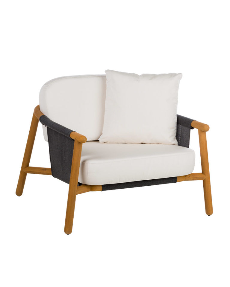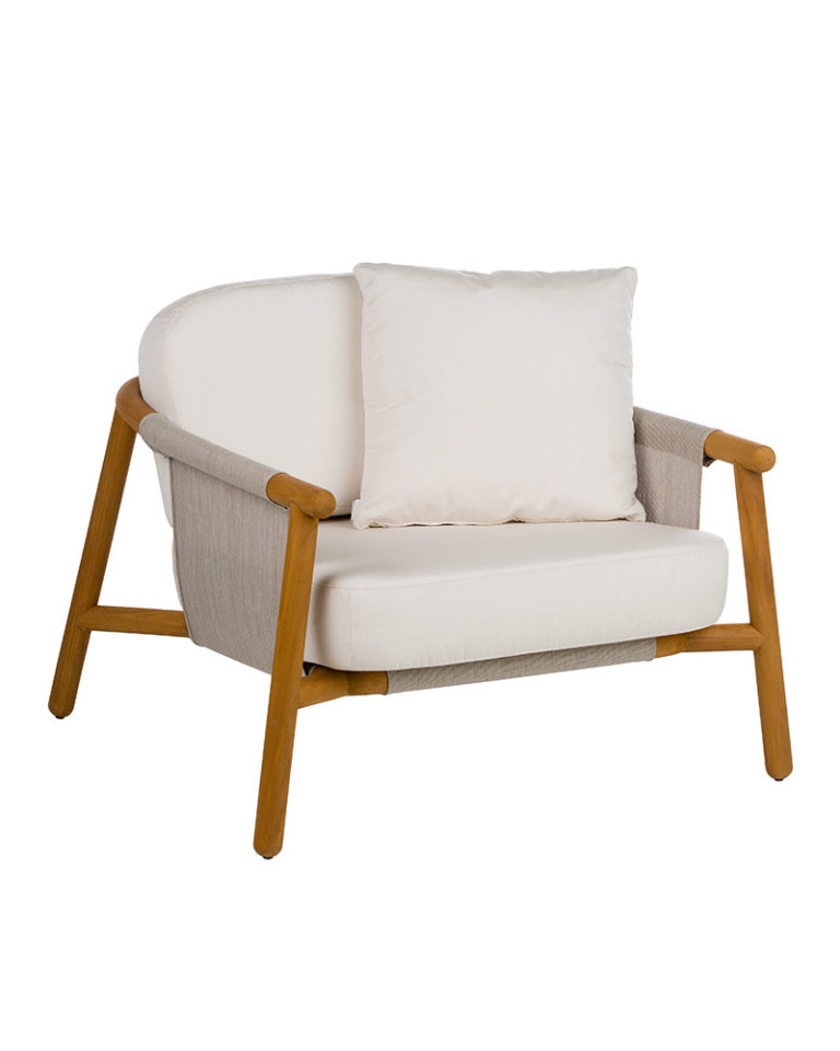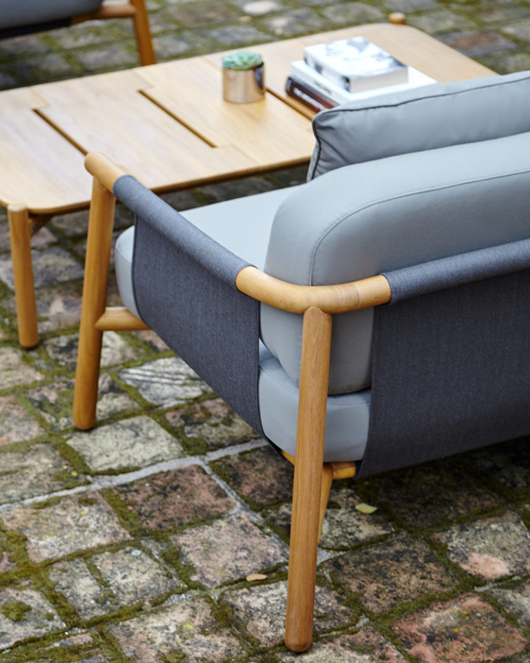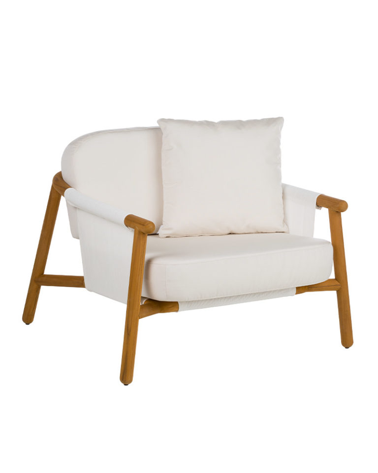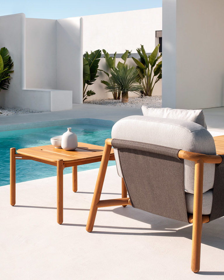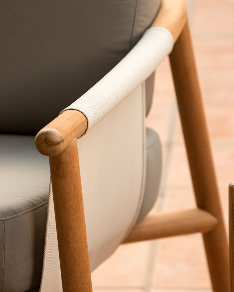 Un sofá neominimalista cuyo discurso se apoya en la calidad del material natural, la madera de teca. Con una gran complejidad técnica la madera se ha torneado y doblado creando una pieza llena de expresividad. Un esqueleto que mediante una tela de PVC tensada forma la base y el respaldo para apoyar los cojines de alta resistencia elaborados en espuma de poliuretano.