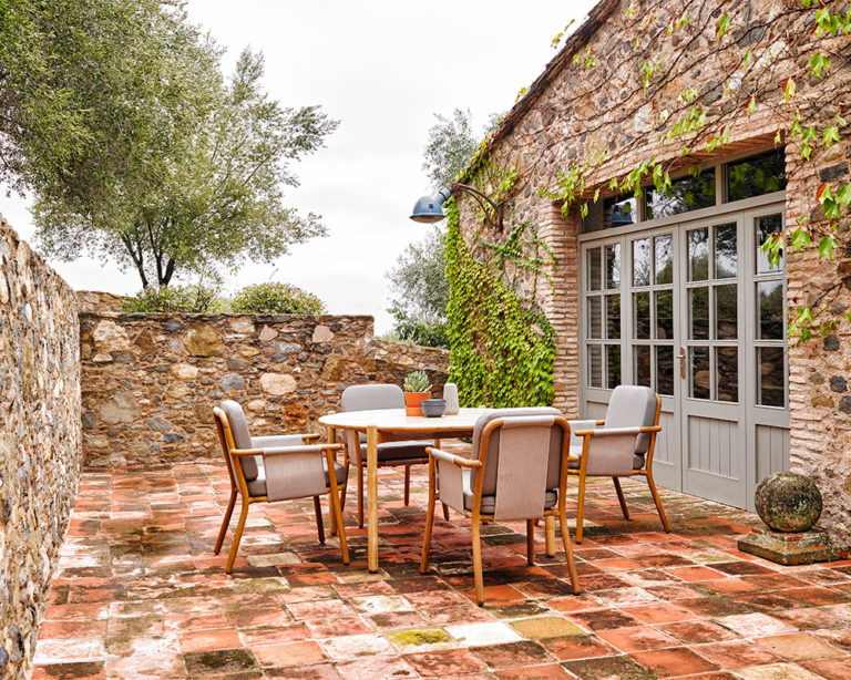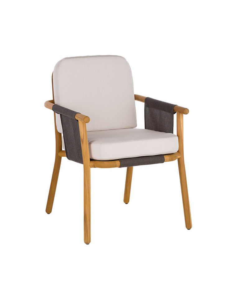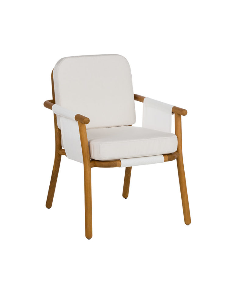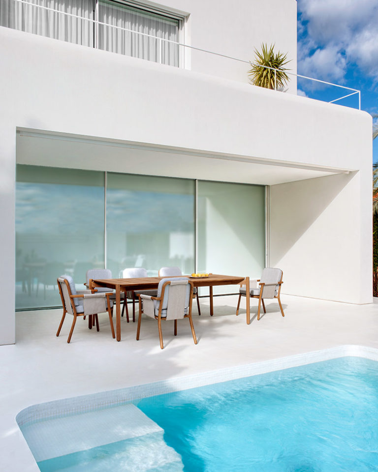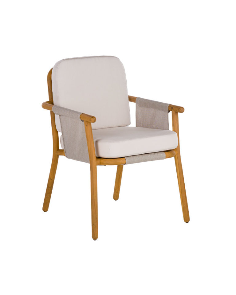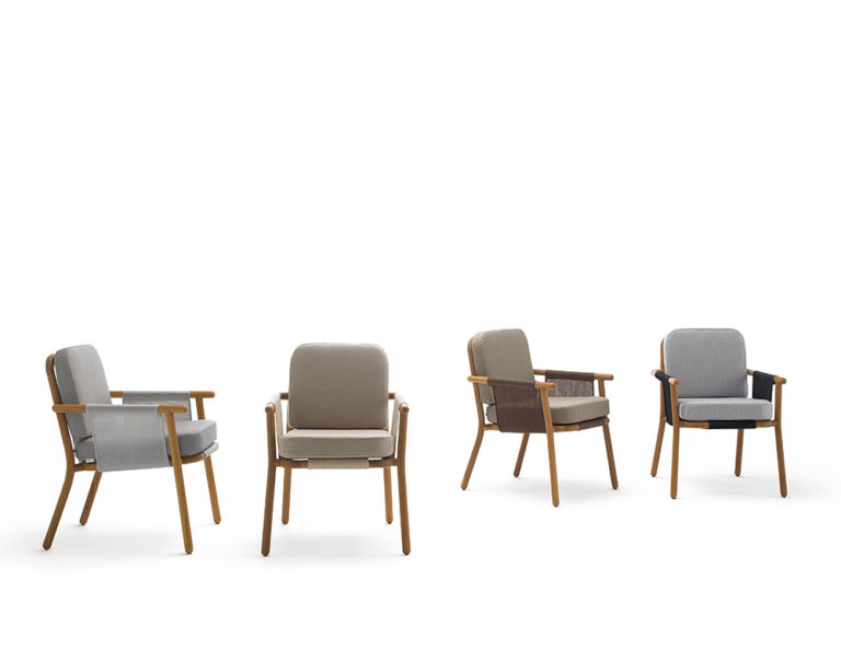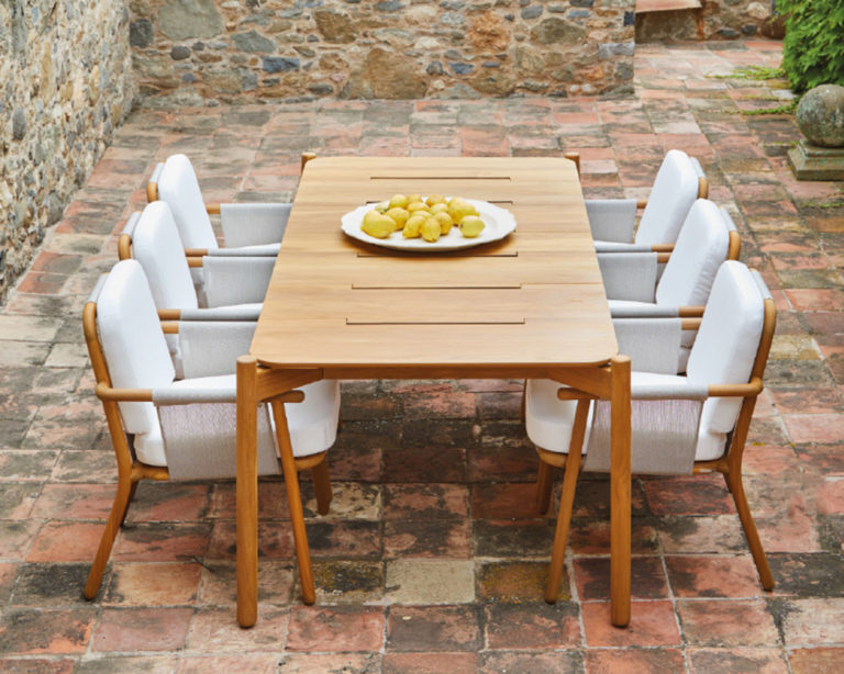 Un sofá neominimalista cuyo discurso se apoya en la calidad del material natural, la madera de teca. Con una gran complejidad técnica la madera se ha torneado y doblado creando una pieza llena de expresividad. Un esqueleto que mediante una tela de PVC tensada forma la base y el respaldo para apoyar los cojines de alta resistencia elaborados en espuma de poliuretano.