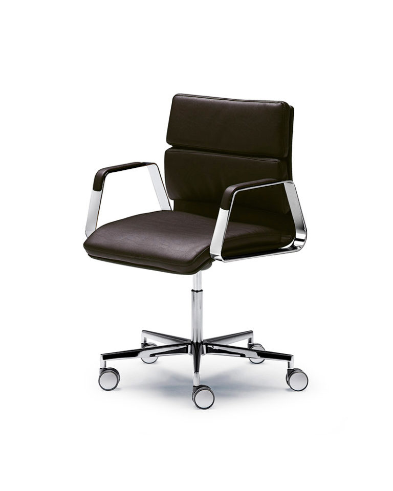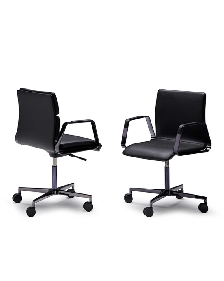 La silla de trabajo ONNA es funcional y refinada. Un diseño nostálgico, que traduce la configuración de la clásica silla de oficina a unas proporciones contemporáneas. Tapizada en piel técnica, para una mejor comodidad, a su versión confort se le incorpora un asiento y respaldo acolchado de mayor densidad. Base de cinco ejes con ruedas. Sistema basculante, ajustable en altura e inclinable.