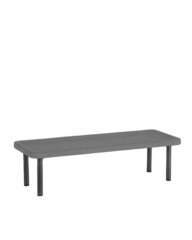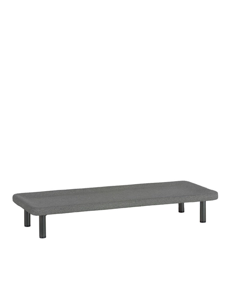 Este accesorio de granito abujardado está diseñado para acompañar y superponerse a las mesas de centro de la colección PAL. Con sección de cantos redondeados para suavizar la radicalidad de las líneas, el sobre se eleva mediante unas patas realizadas en pletina de aluminio pintado epoxi en color oliva 64.