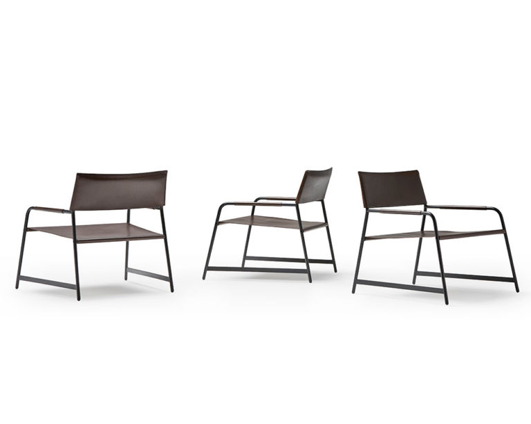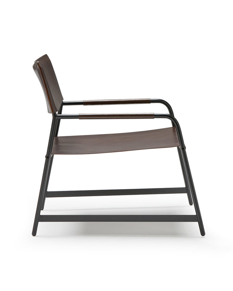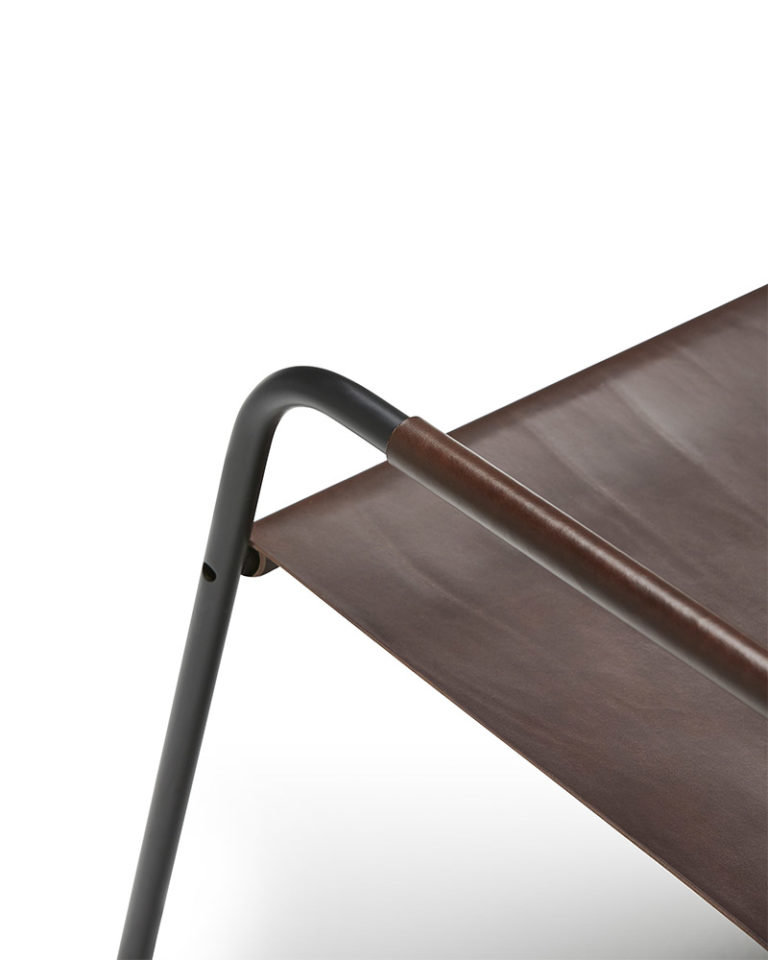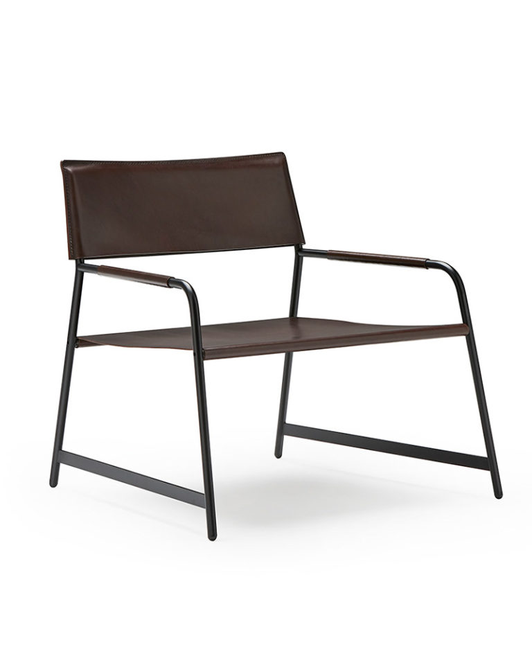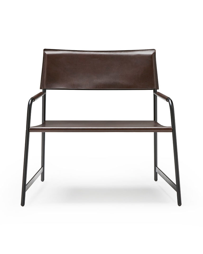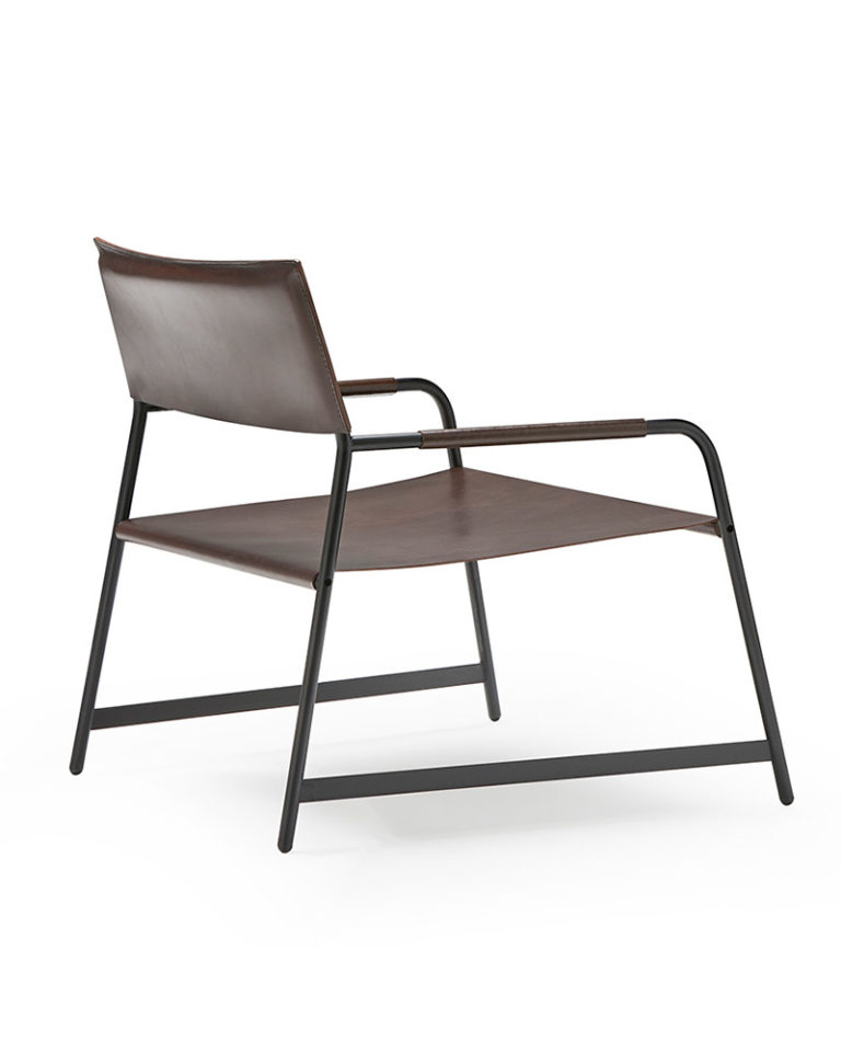 La butaca PAOLA, disponible en piel marrón, es una declaración de simplicidad. Un diseño reducido a lo esencial en el que el cuerpo, confeccionado en piel, viste parcialmente el asiento y el respaldo bajo la dirección de una estructura de acero tubular. Trazando un trapecio, las patas integran el detalle del reposabrazos tapizado, mientras la estabilidad de la pieza reside en la tensión precisa del cuero. Se trata de una estructura liviana y sin distracciones.