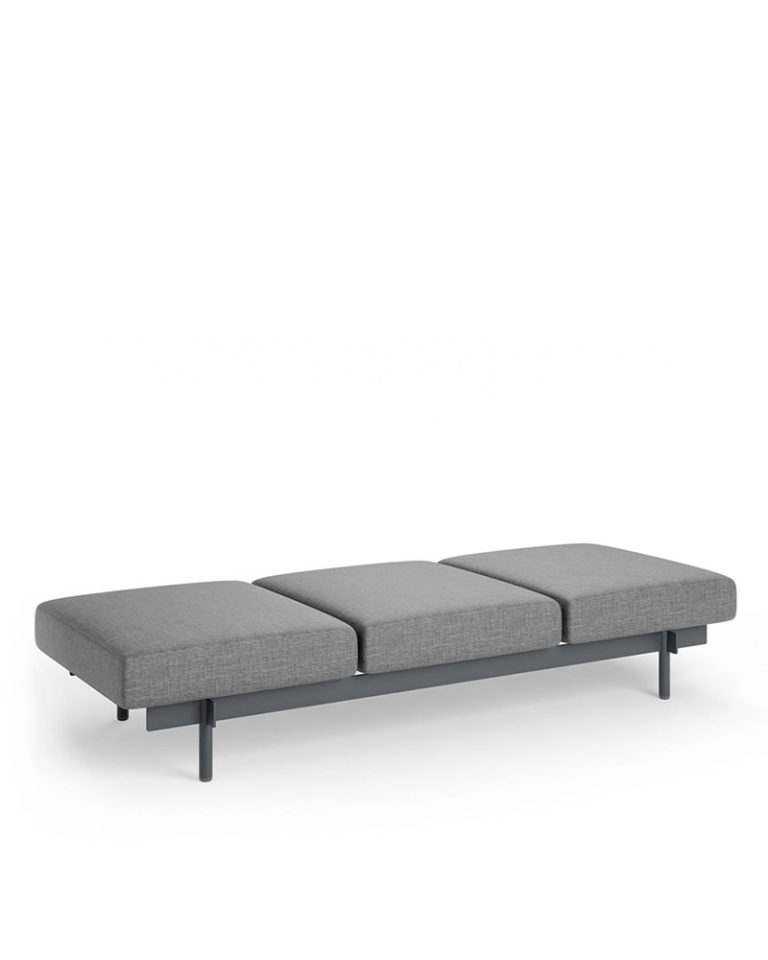 Con un esquema limpio y refrescante, este banco de exterior se caracteriza por la una estructura de aluminio que mezcla pletinas rectangulares con patas tubulares y cojines de alta resistencia.