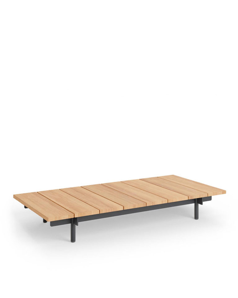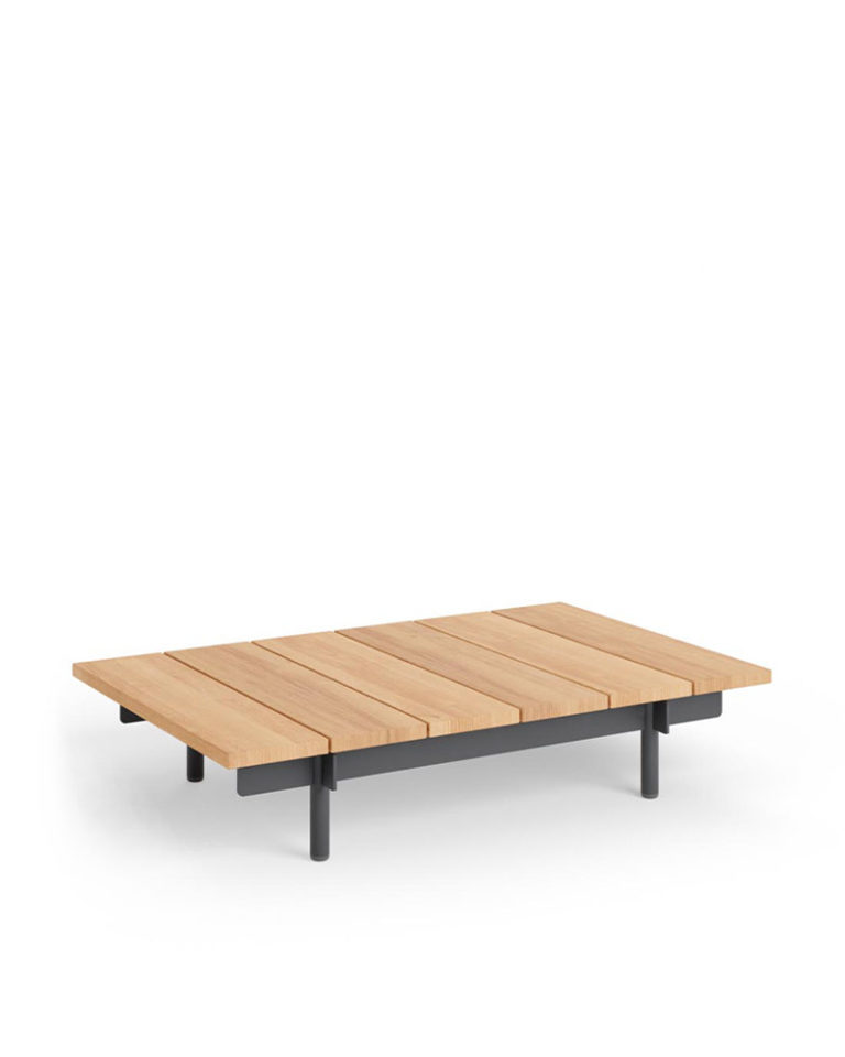 Con un esquema limpio y refrescante, esta mesa de centro para exterior se caracteriza por una estructura de aluminio que mezcla pletinas rectangulares con patas tubulares y un sobre de madera de iroko.