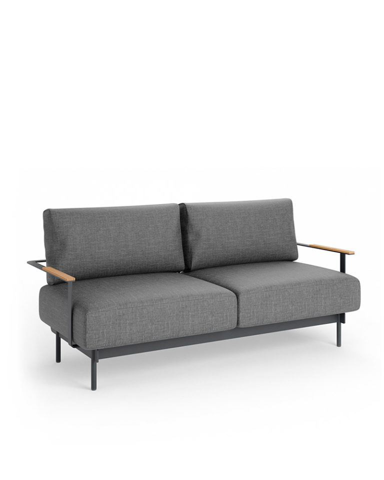 Con un esquema de diseño limpio y refrescante, este sofá de exterior se caracteriza por un entramado de cintas que envuelve por completo su respaldo y crea una interesante conexión con el aluminio y los cojines. Su estructura mezcla pletinas rectangulares con patas tubulares y apoyabrazos de madera de iroko.