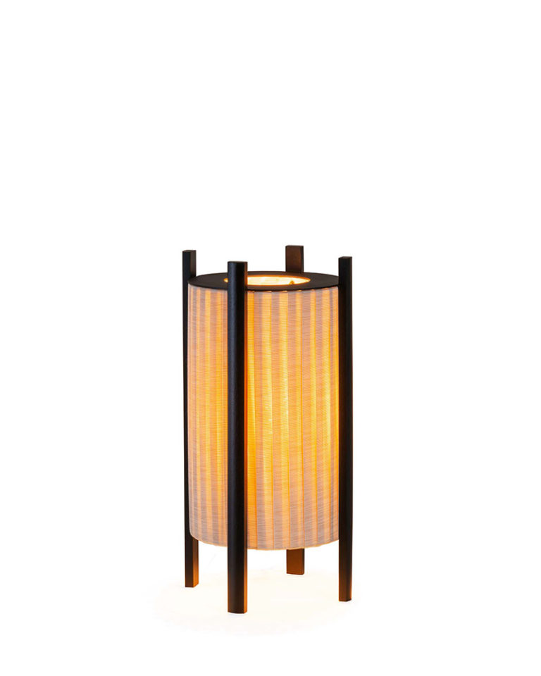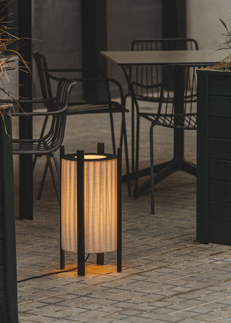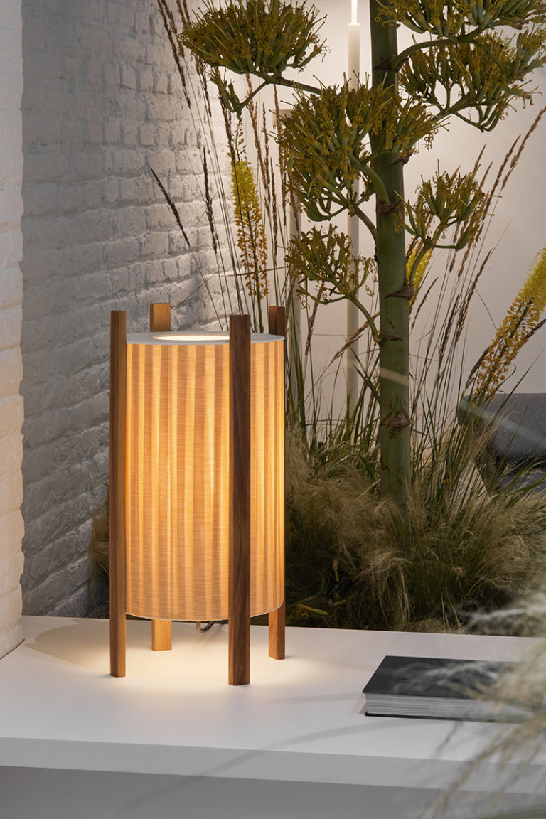 Proyectada como un cilindro, esta nueva lámpara diseñada para Milan Iluminación se construye básicamente a través de cintas que envuelven el punto de luz mientras un disco plano metálico cubre parcialmente la parte superior para ocultarlo. Las cuatro patas de madera que elevan y sujetan el cuerpo comparten una forma plana redondeada que contribuye a su sencillez y a la sensación de ligereza general. El acabado de estos listones, disponibles en madera natural o lacada, define la identidad final de la pieza. Un diseño construido a base de materiales también adecuados para exterior.