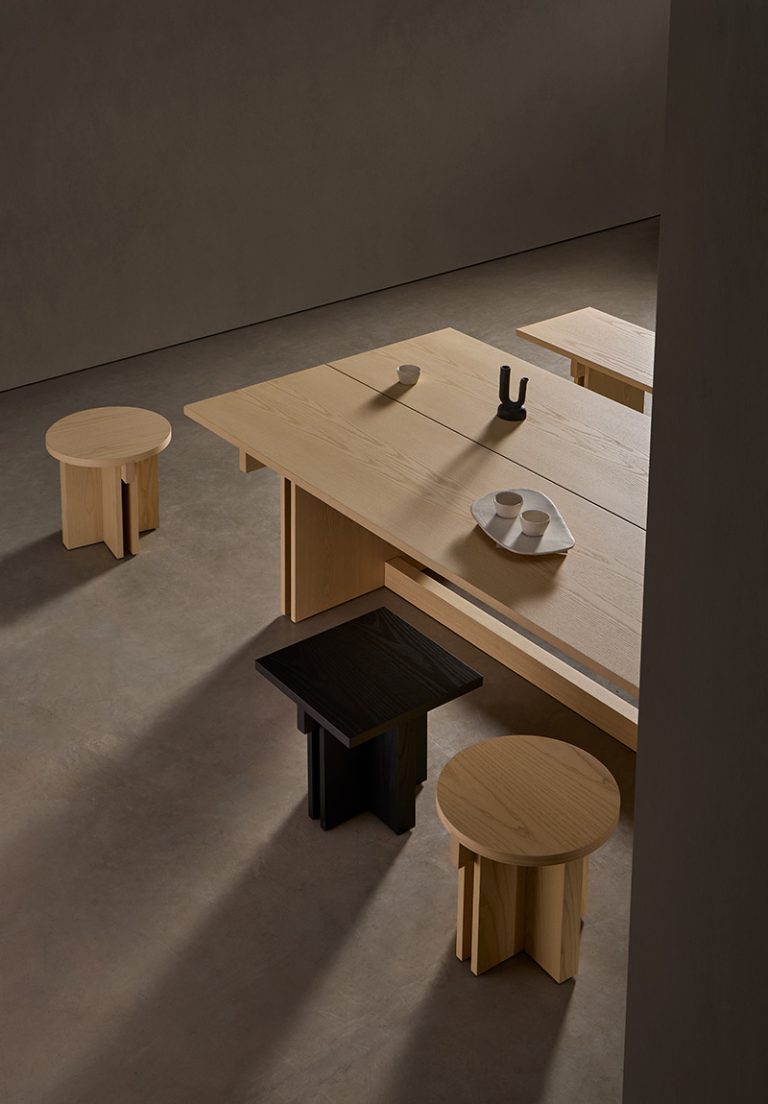 Con referencias tanto al pasado como al presente, Rak puede interpretarse como un relato arquitectónico racionalista. Los ángulos duros y la superposición e intersección de tablas de madera de fresno, natural o teñido, definen estas mesas de centro, auxiliares y consola que conforman la colección. Se trata de un diseño cálido y acogedor que, a pesar de su sencillez, agregará personalidad a cualquier interior.