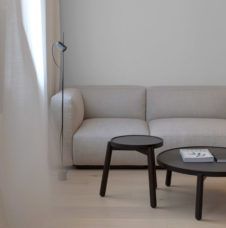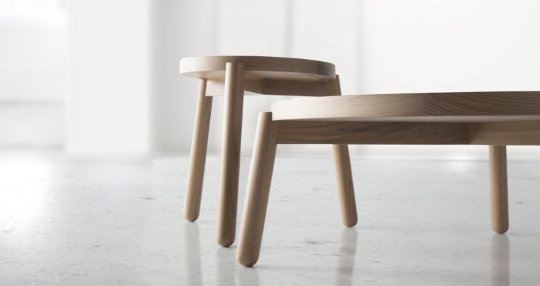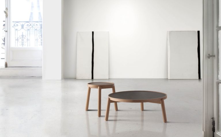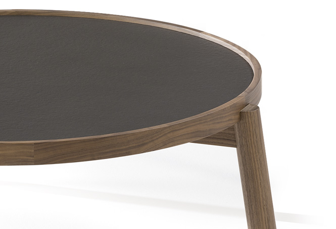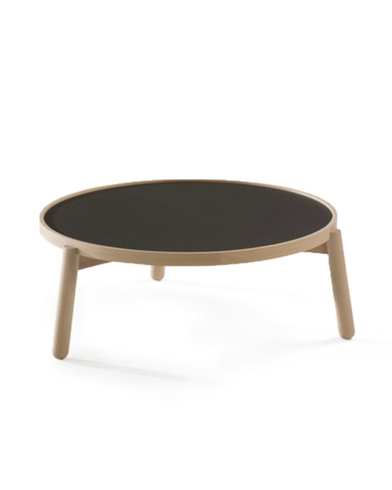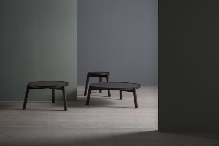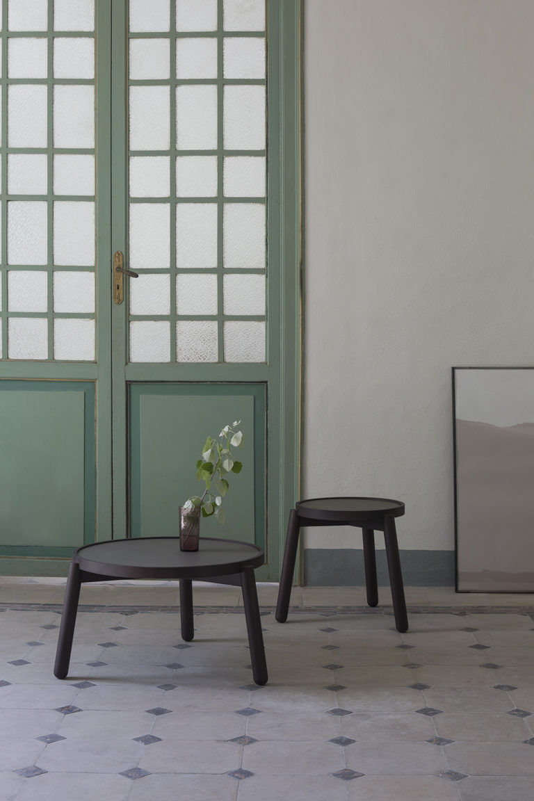 Esta colección de mesas auxiliares tiene varias particularidades. Una de las más destacables es su tapa circular o sobre, que es intercambiable y está disponible en varias tonalidades de cerámica. Otra característica destacable de las mesas son sus tres patas torneadas, que les aportan dinamismo. Las piezas de madera están fabricadas con madera maciza de haya natural o teñida en color ceniza.